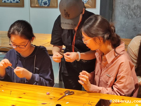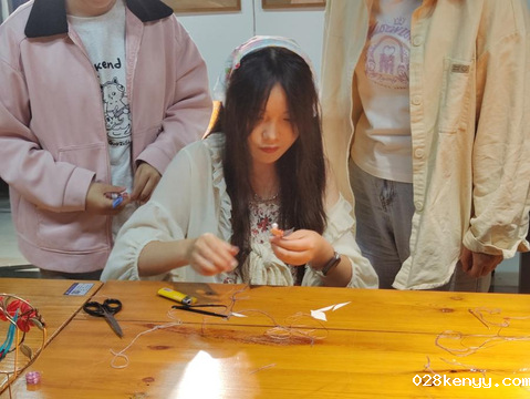 图为谢静副教授及团队成员杨丹、苏熠、王婷耐心向同学们示范缠花细节并纠错。同学们认真听讲,学习新知识,并在亲手制作中感受了非遗之美,在传承非遗文化的同时,“解锁”了新技能。