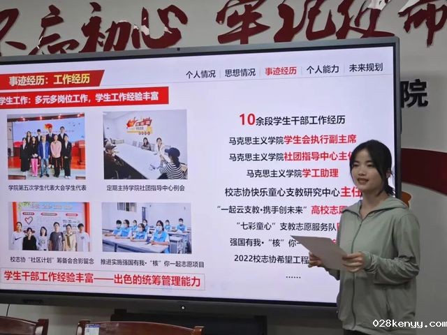 活动伊始,经个人申报,学院资格审查后的十名同学依次上台进行答辩。她们通过PPT详细展示了自己在校期间的事迹和在学习、社会实践、志愿服务等方面的经历与成就。每一位同学的演讲生动具体,流畅自如,讲述了她们入学以来的点滴进步。